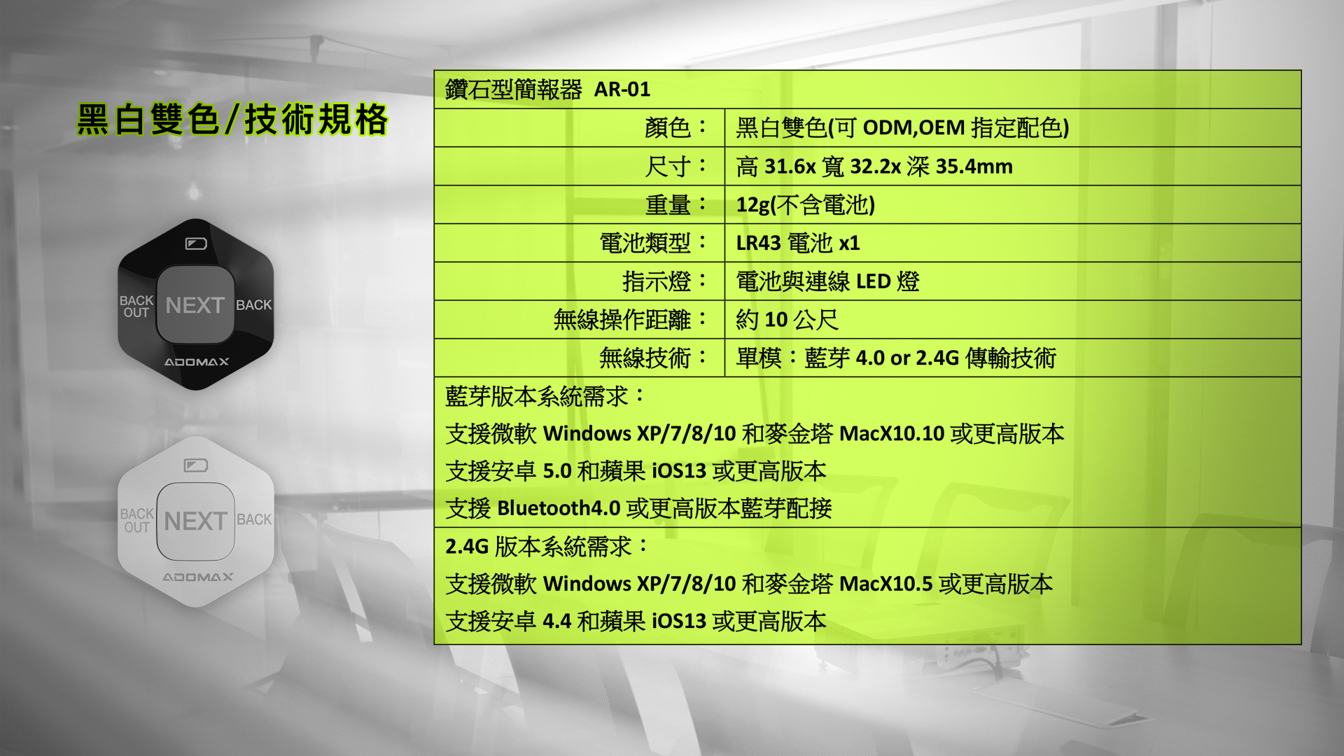 | 無線技術: | 單模:藍芽4.0 or 2.4G傳輸技術 |