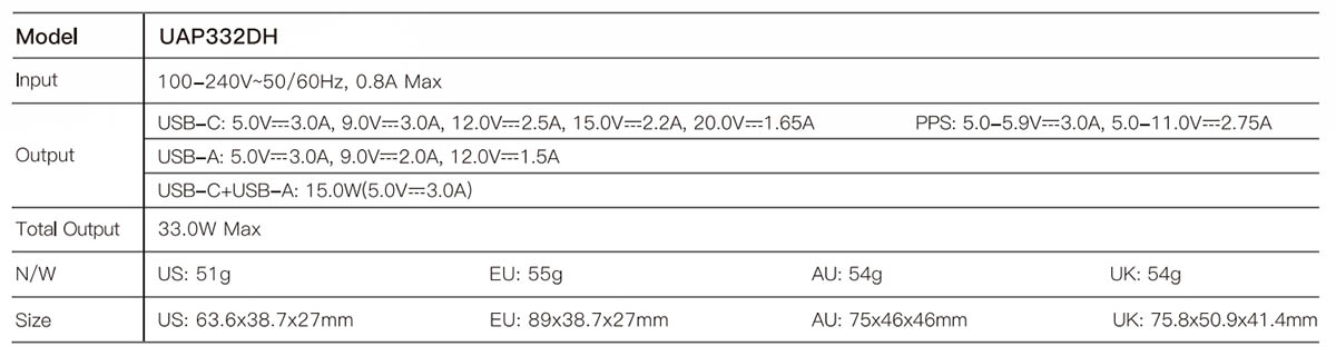 UAP332DH / UAP331DH 33W Wall Charger 33W PO fast chargerDual output portsCompact designIdeal for iPhone & iPad