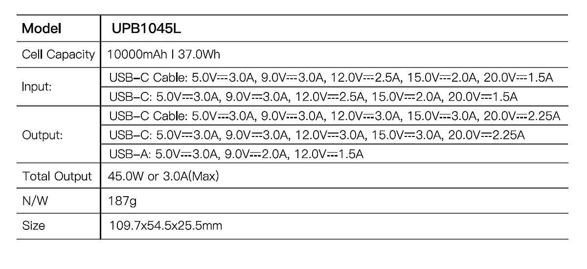 UPB1045L 10,000mAh Built-in Cable Power Bank 45W PD chargingBattery capacity digital readoutBuilt-in USB-C cableCustom color options