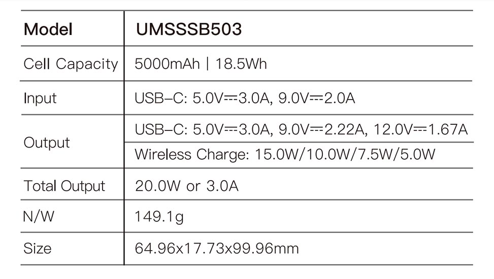 UMSSSB503 5,000mAh Magnetic & Wireless Charging Power Bank Semi-solid state battery15W Wireless charging20W PD fast charging (USB-C output)Snap-N-Go wireless & magnetic charging